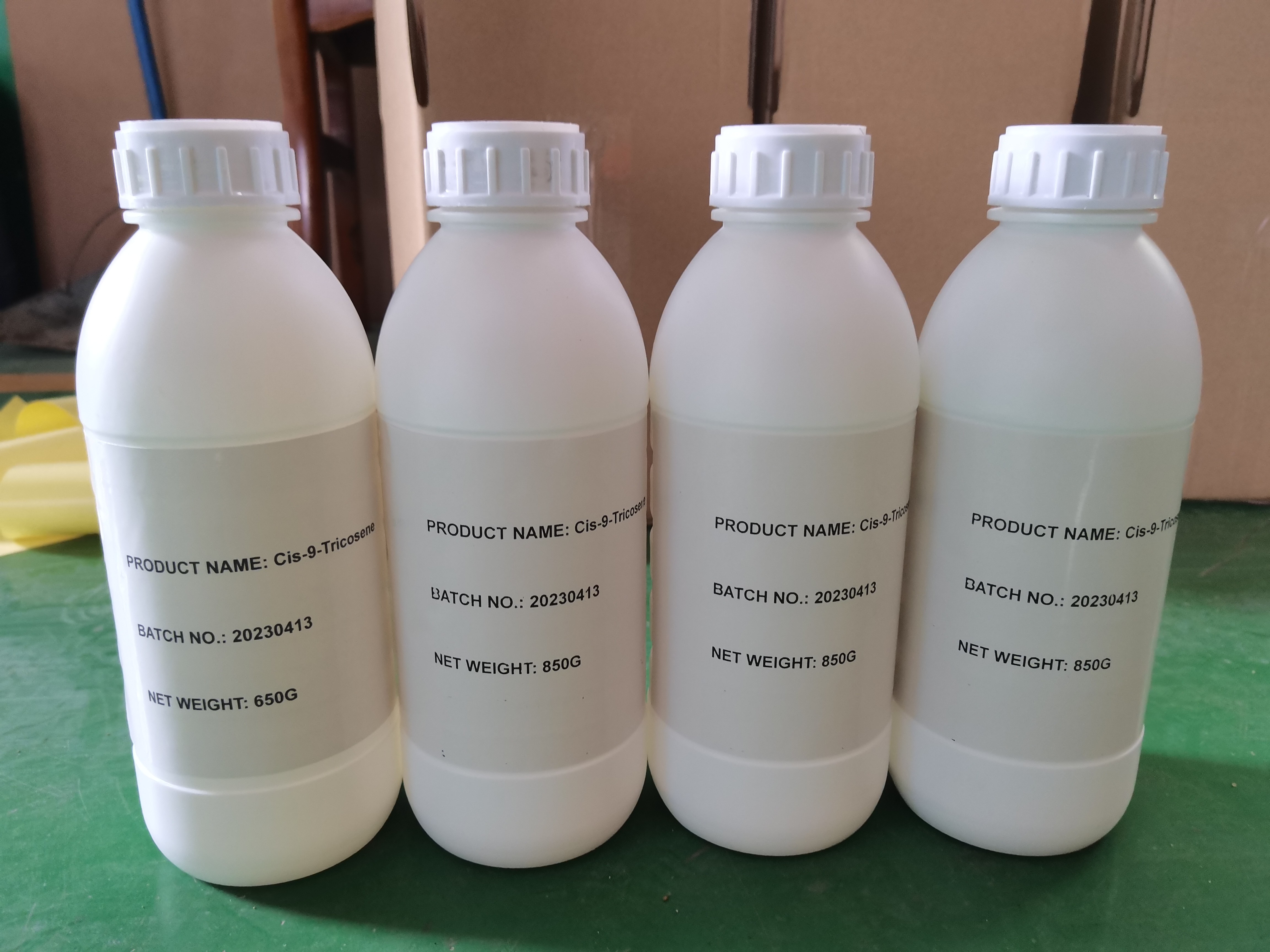 Z-9-Tricosene is a sex pheromone produced by female house flies (Musca domestica) to attract males. In bees, it is one of the communication pheromones released during the waggle dance. This product is an insect pheromone synthesized by our company using a chemical synthesis method. It has a good attracting effect on cockroaches and flies. It can improve the insecticidal efficiency of insecticides when used in combination with insecticides. This product is only used as an attractant in insecticides.